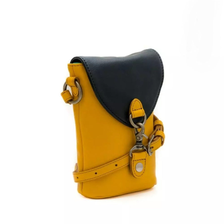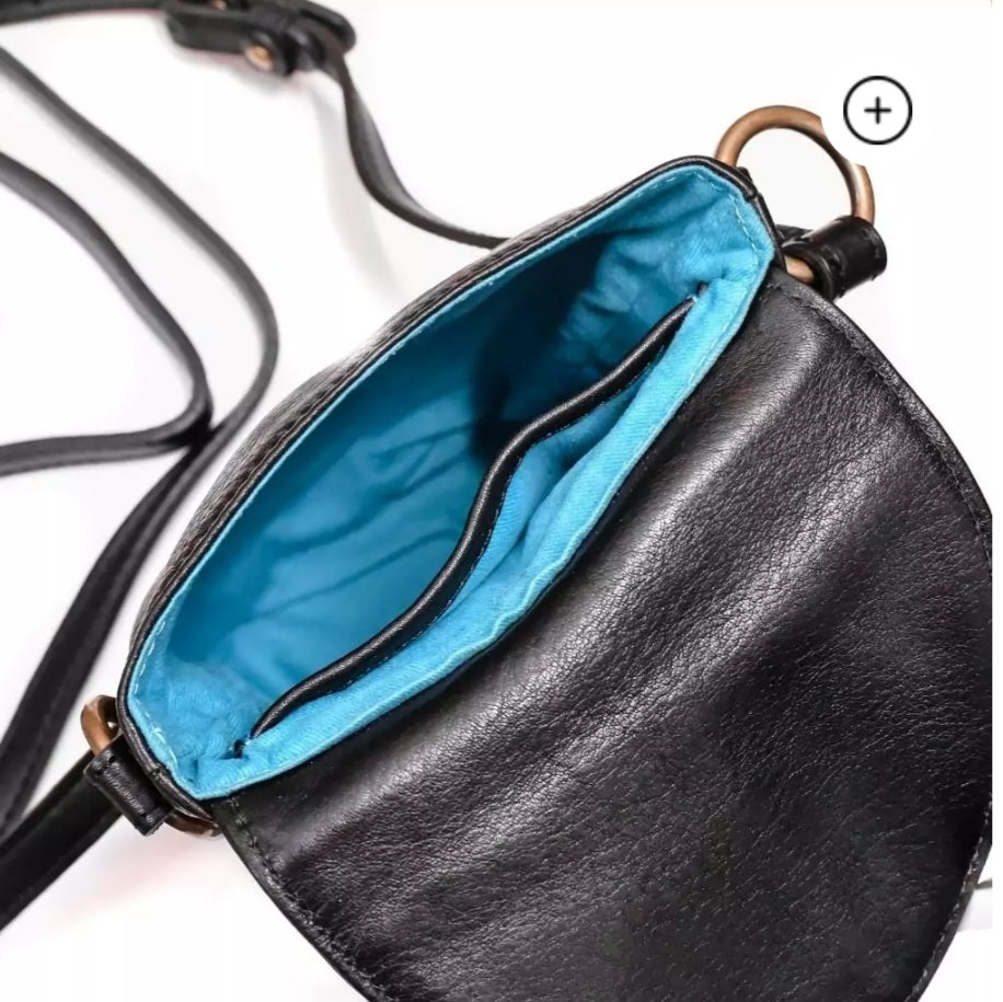 Vegetable tanned leatherTurquoise organic cotton liningAntique Brass hardware1 slip pocketMagnetic closureShoulder strap 109 – 124 cm10.5 x 18 x 4.5 cm