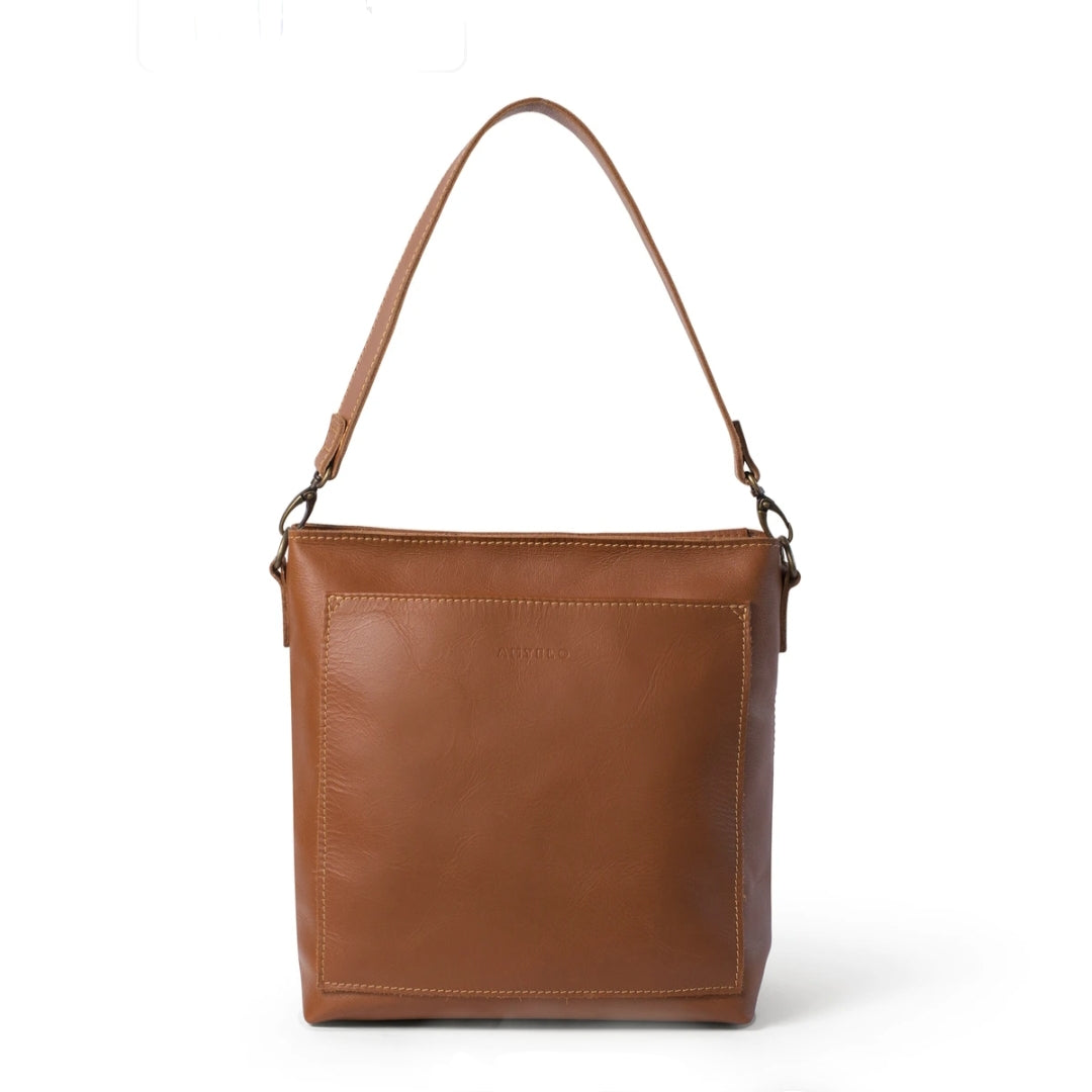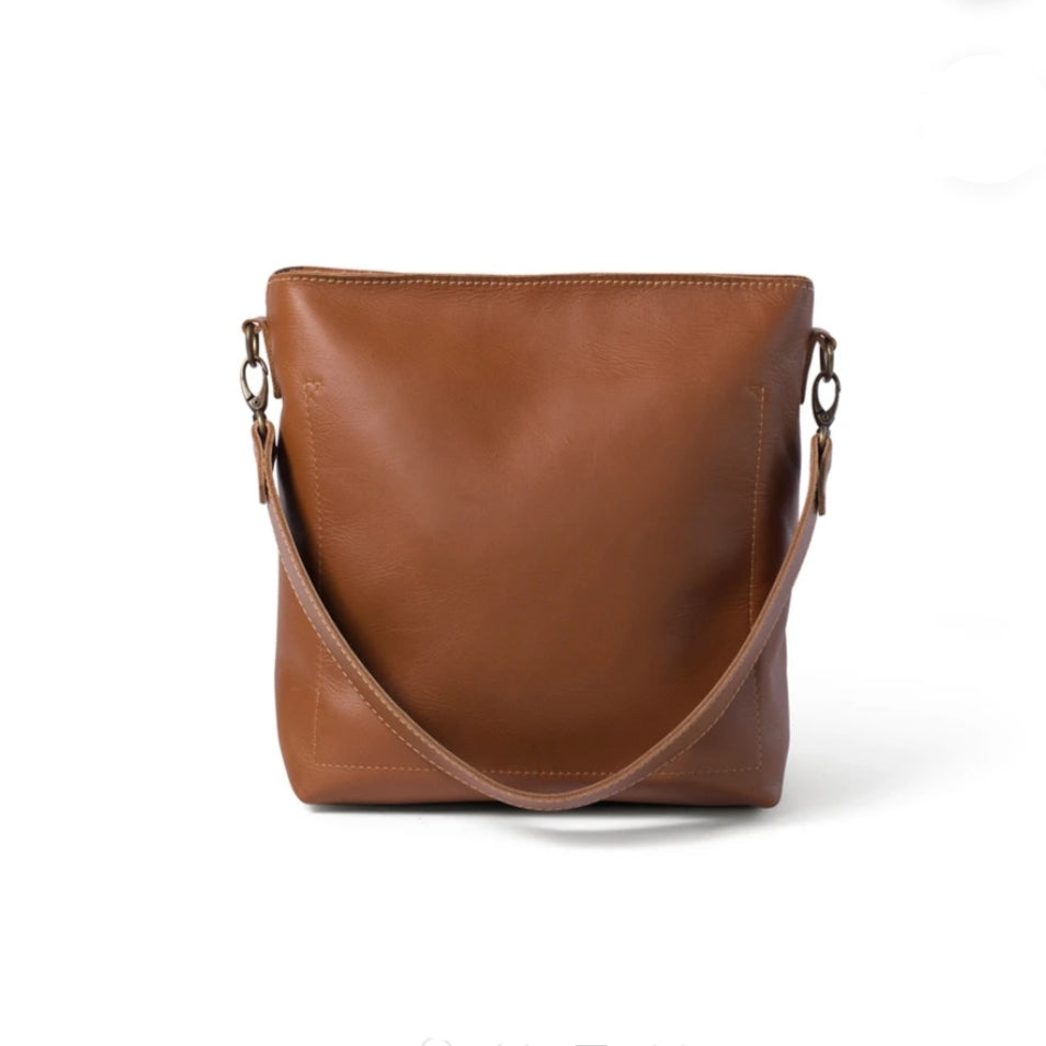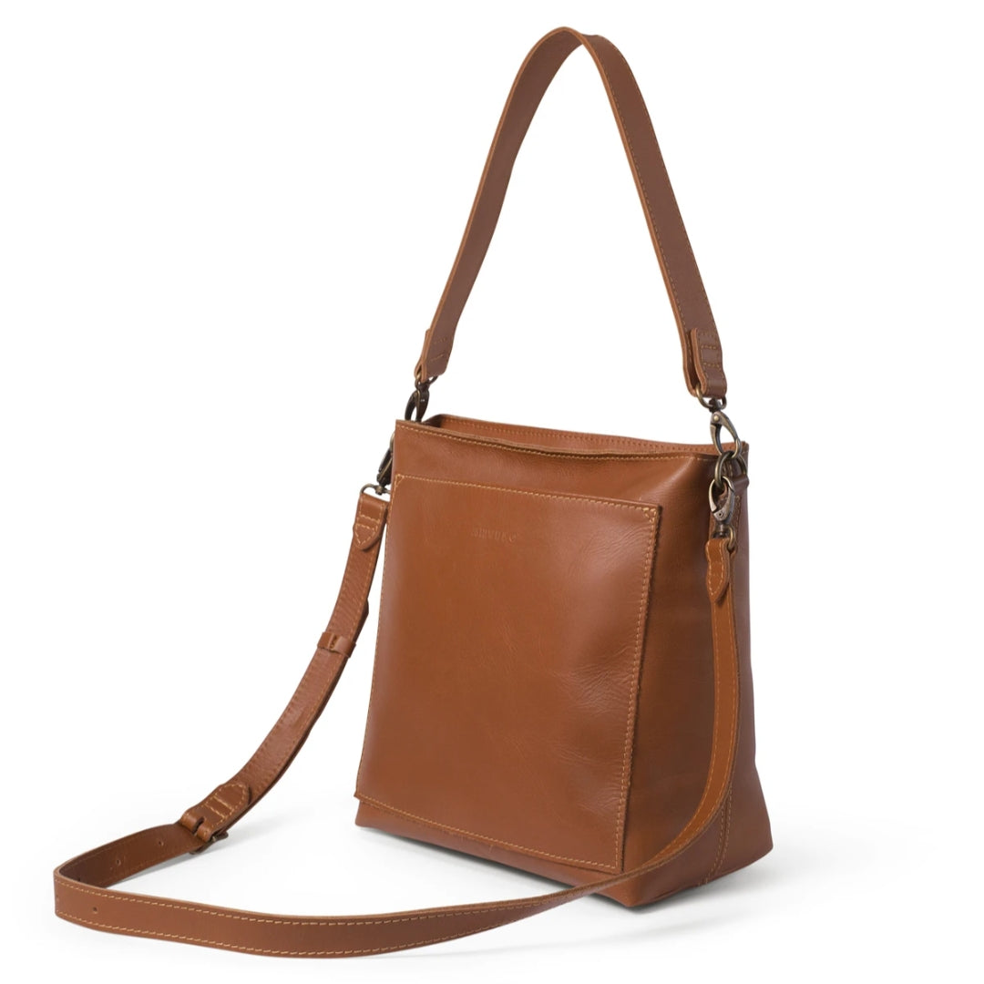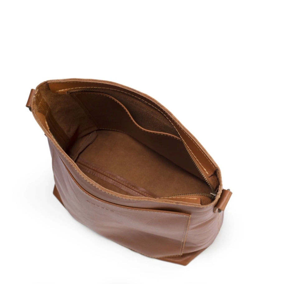 100% South African Bovine Leather Antique Brass hardware Unlined to expose the beautiful raw nature of the leather Unstructured YKK zip Size: 31cm (width at top) x 29cm (height) x 14cm (depth) Large slip pocket inside and outside Detachable shoulder strap Detachable, Adjustable sling